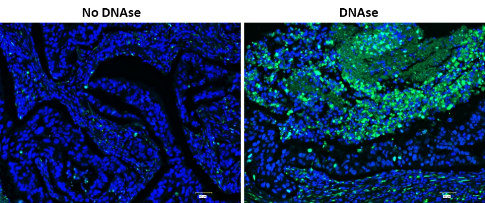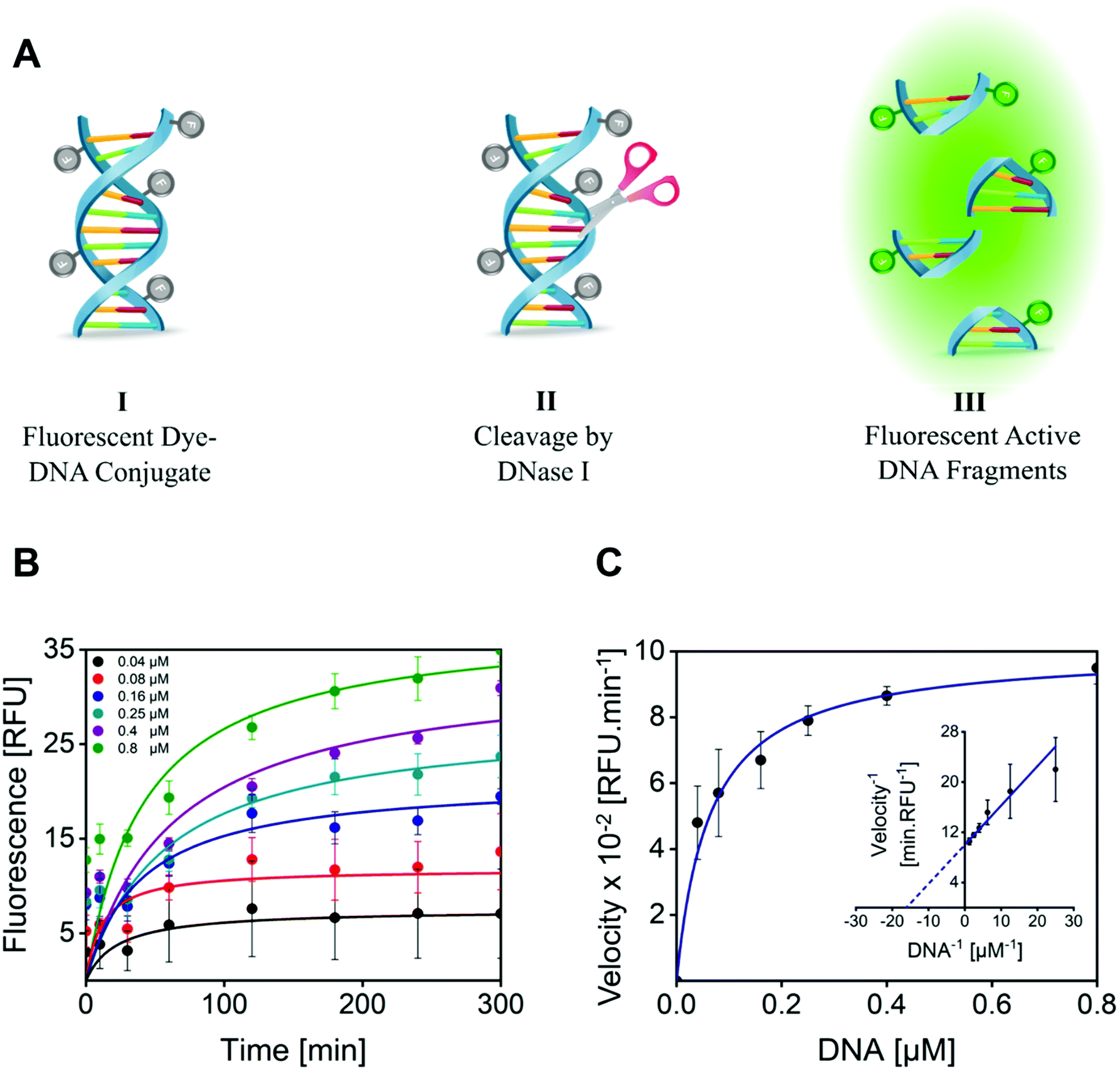 DNase assay kits (fluorescence) are used to detect the presence and activity of DNase enzymes in samples such as buffers, reagents, and other components. These kits are based on the use of a fluorophore-labeled DNA probe. When the probe is intact, it does not produce a fluorescent signal. However, when the probe is degraded by DNase, the fluorophore is released and produces a fluorescent signal. The intensity of the fluorescent signal is proportional to the amount of DNase activity in the sample.